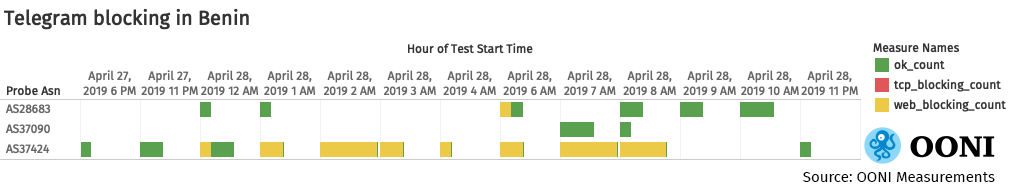 The following chart, based on OONI data collected from Benin, illustrates the blocking of social media sites on 28th April 2019, amid Benin’s 2019 parliamentary elections.