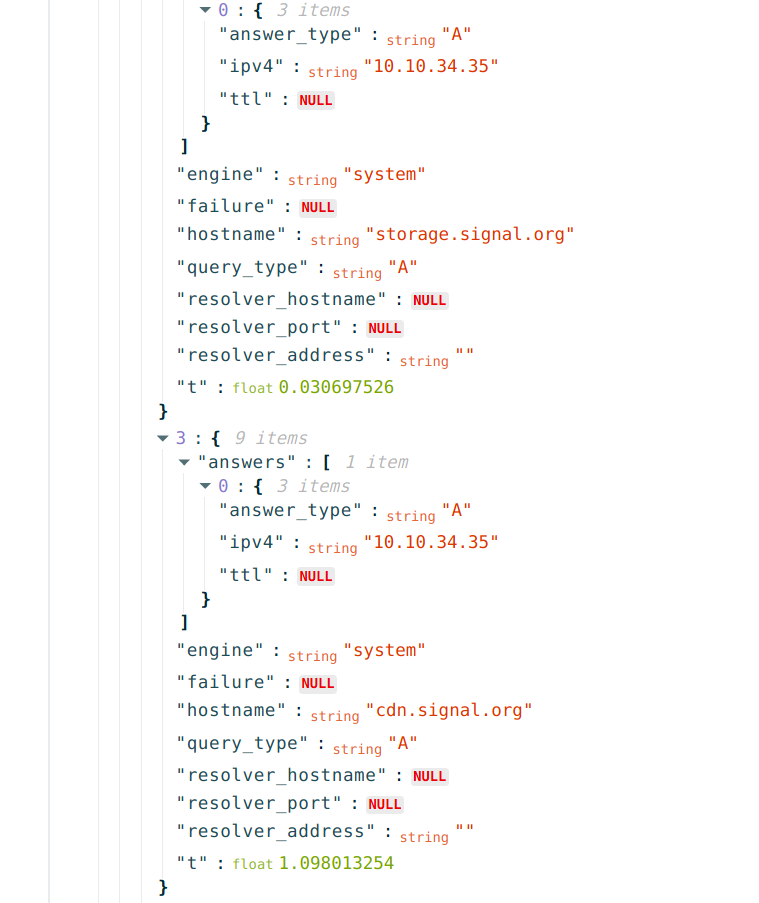 Specifically, the domain names api.directory.signal.org, storage.signal.org, cdn.signal.org, uptime.signal.org, cdn2.signal.org, and sfu.voip.signal.org all resolve to the IP 10.10.34.35. The following snippet (taken from a relevant OONI measurement) illustrates this.