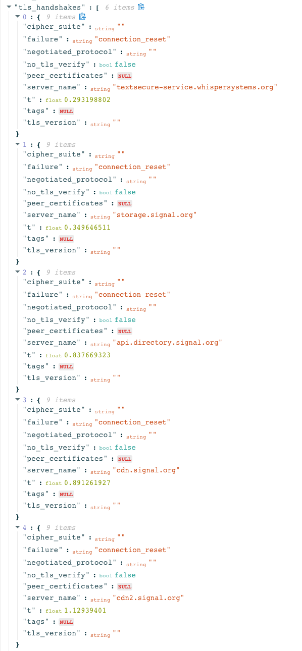 Anomalous Signal measurements show that the TLS handshake to the Signal backend service failed consistently with a connection_reset error. This is likely an indication of the use of Deep Packet Inspection (DPI) technology targeting the SNI field of the TLS handshake.