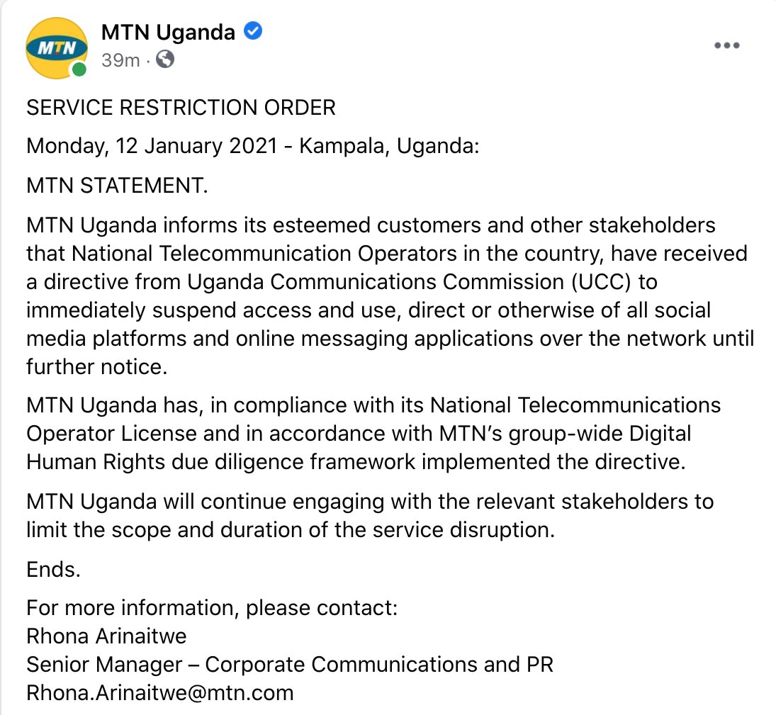 On 12th January 2021, Ugandan ISPs confirmed the blocking of online social media platforms and online messaging applications in compliance with a directive from the UCC.