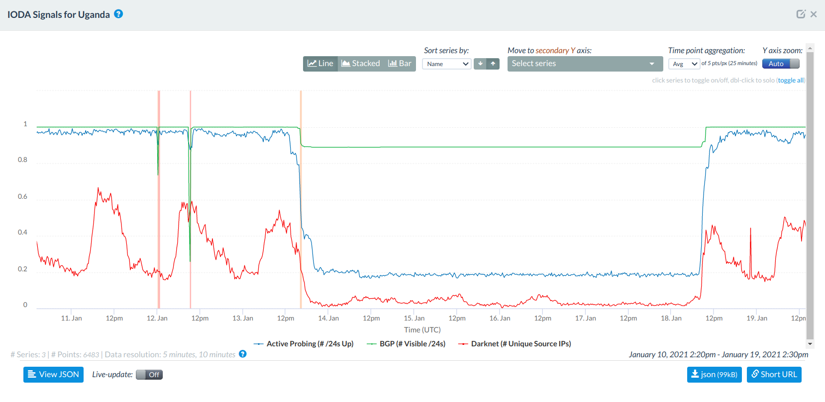 Source: Internet Outage Detection and Analysis (IODA), Active probing signals for networks that experienced short but significant outages before 13th January 2021.