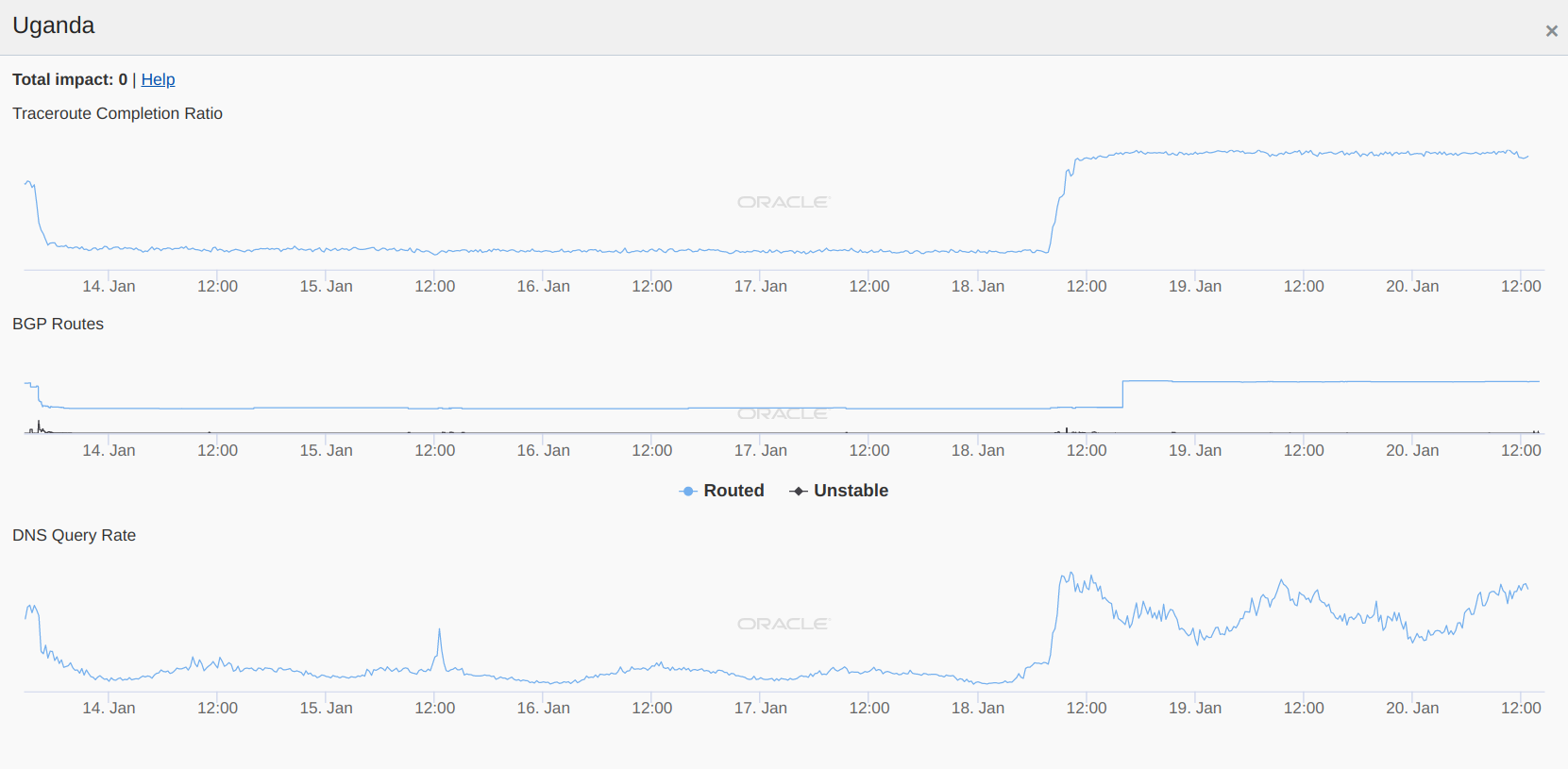 Quite similarly, Oracle’s Internet Intelligence Map tracks internet disruptions worldwide based on three signals: Traceroute completion ratio, BGP routes, and DNS query rate. Between 13th to 18th January 2021, Oracle’s Internet Intelligence Map records the same internet outage in Uganda as IODA data (with almost identical timings in the drop of signals).