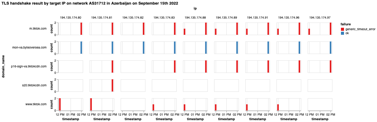 Chart: OONI data on TLS handshake results by target IP on network AS531712 in Azerbaijan on 15th September 2022.