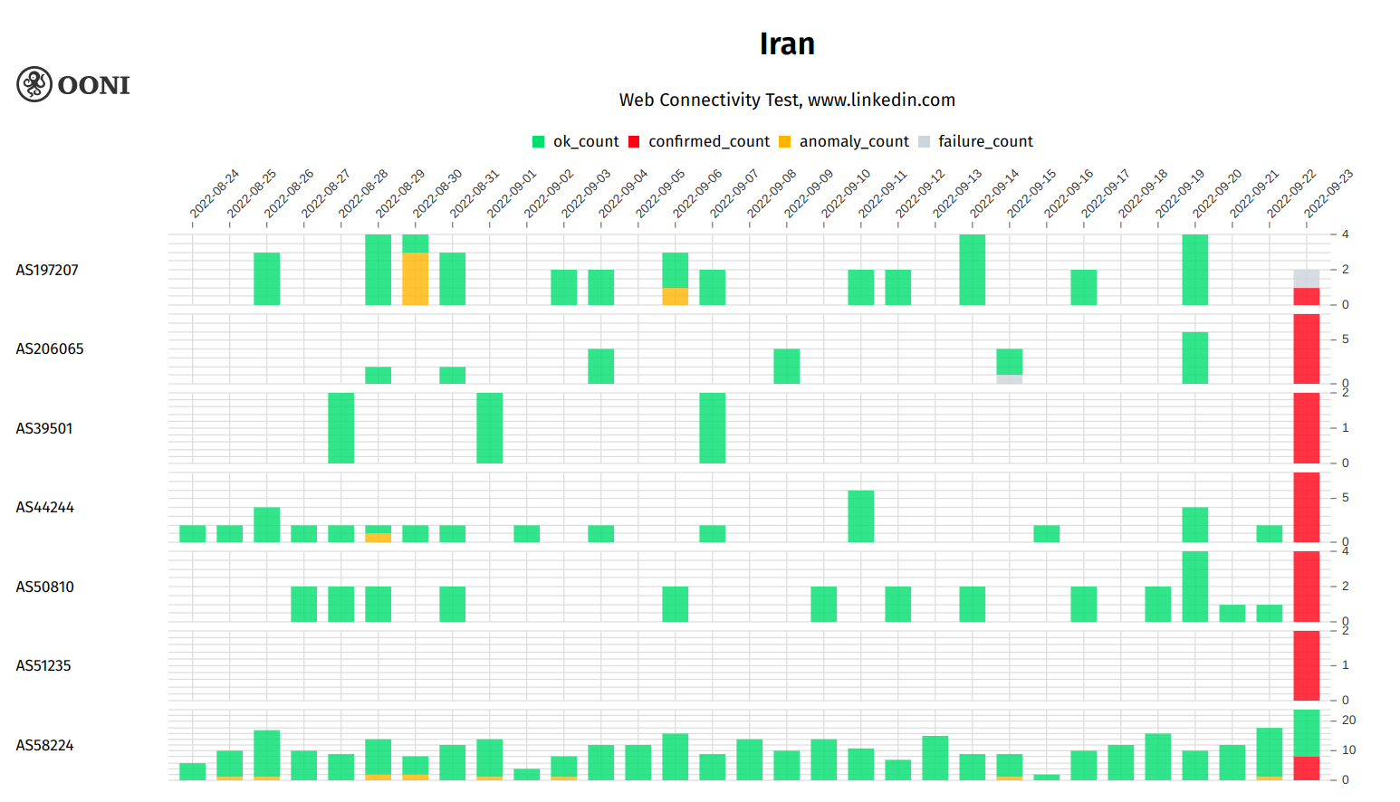 Chart: OONI data on the testing of www.linkedin.com on multiple networks in Iran between August 2022 to September 2022 (source: OONI MAT).