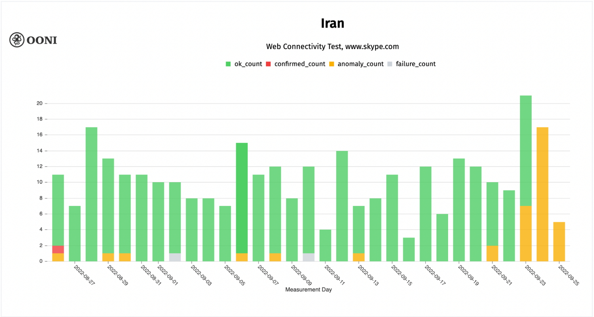 Chart: OONI data on the testing of www.skype.com on multiple networks in Iran between August 2022 to September 2022 (source: OONI MAT).