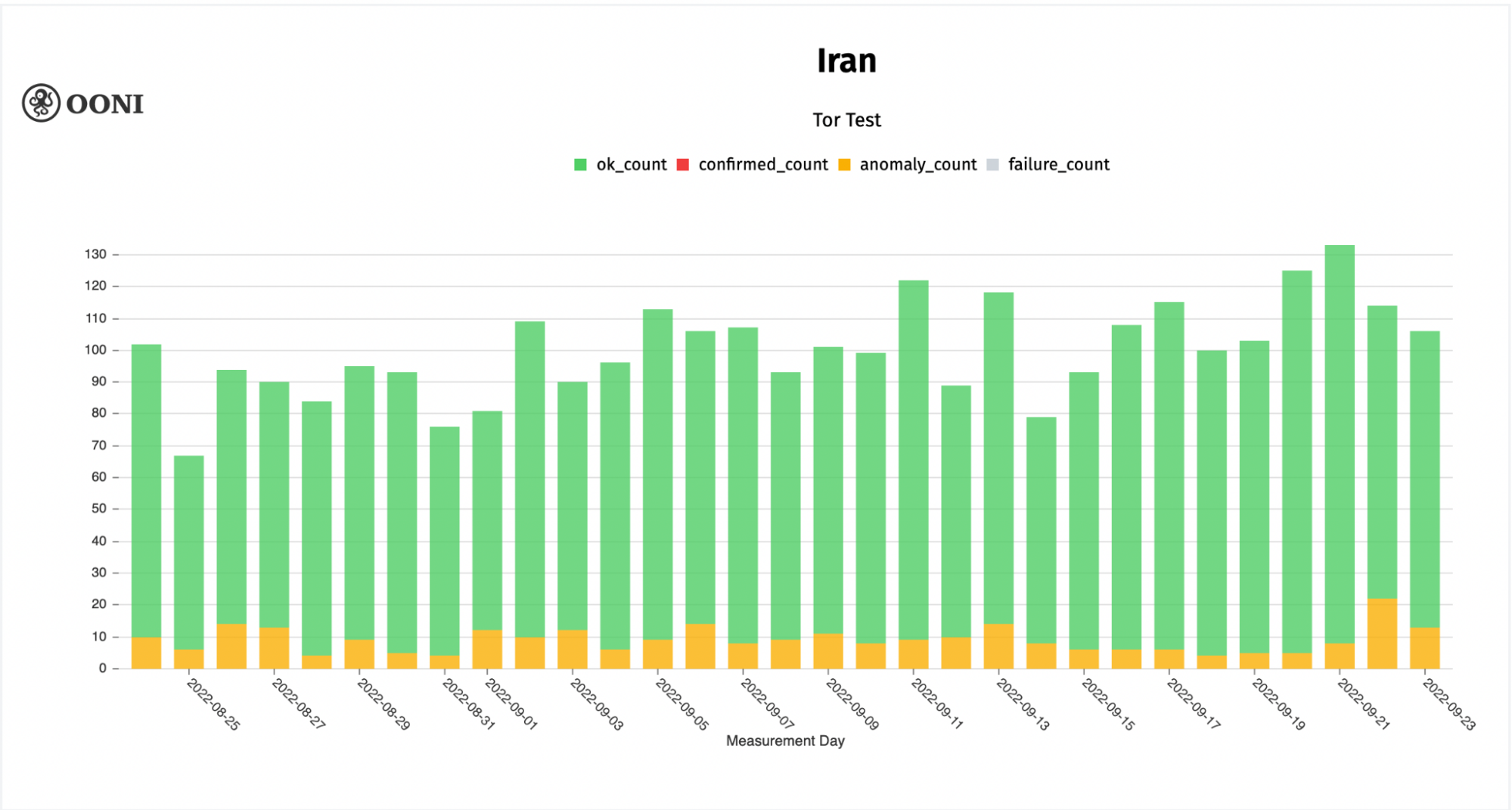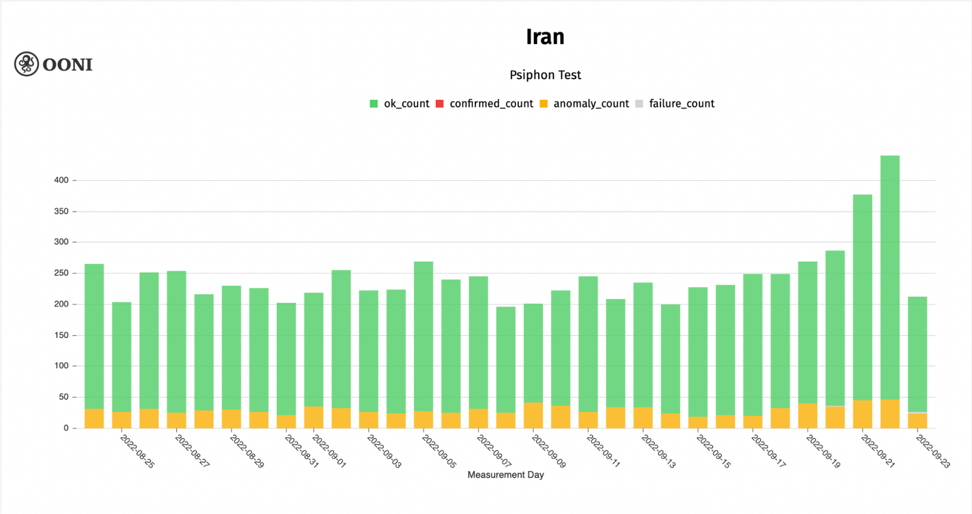 Chart: OONI data on the testing of Tor Snowflake in Iran between August 2022 to September 2022 (source: OONI MAT).