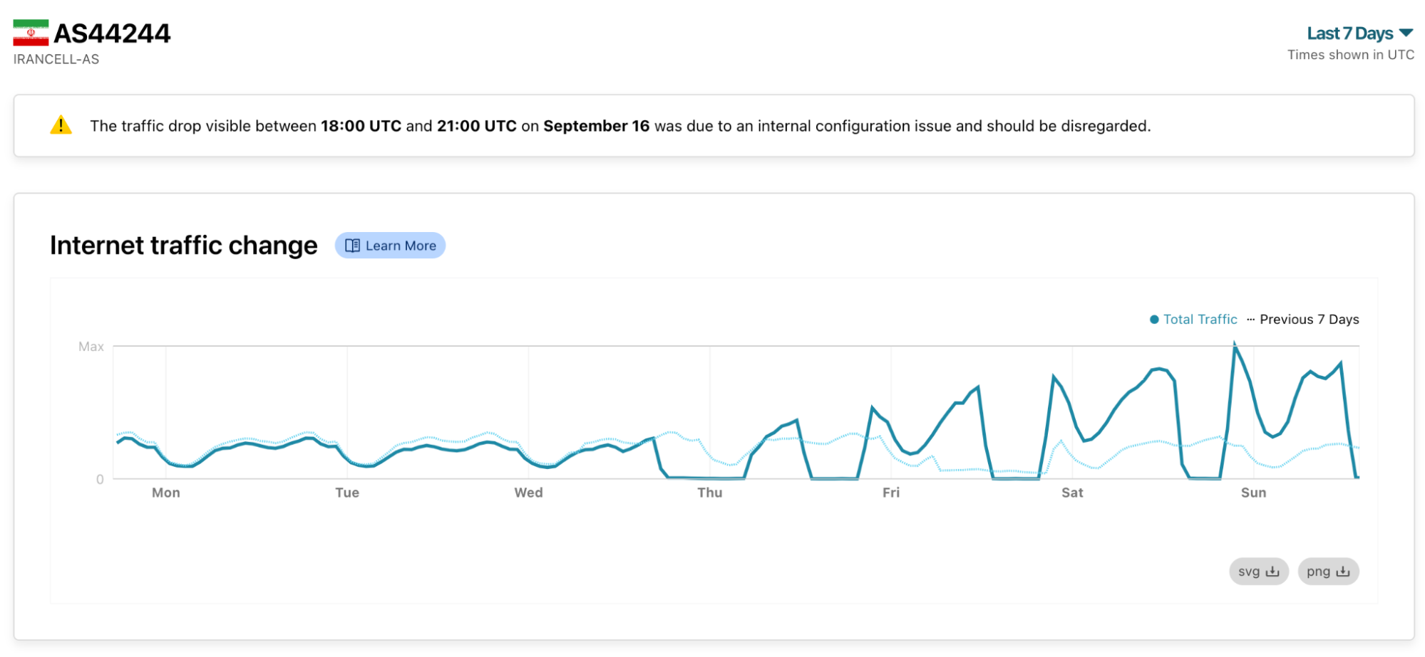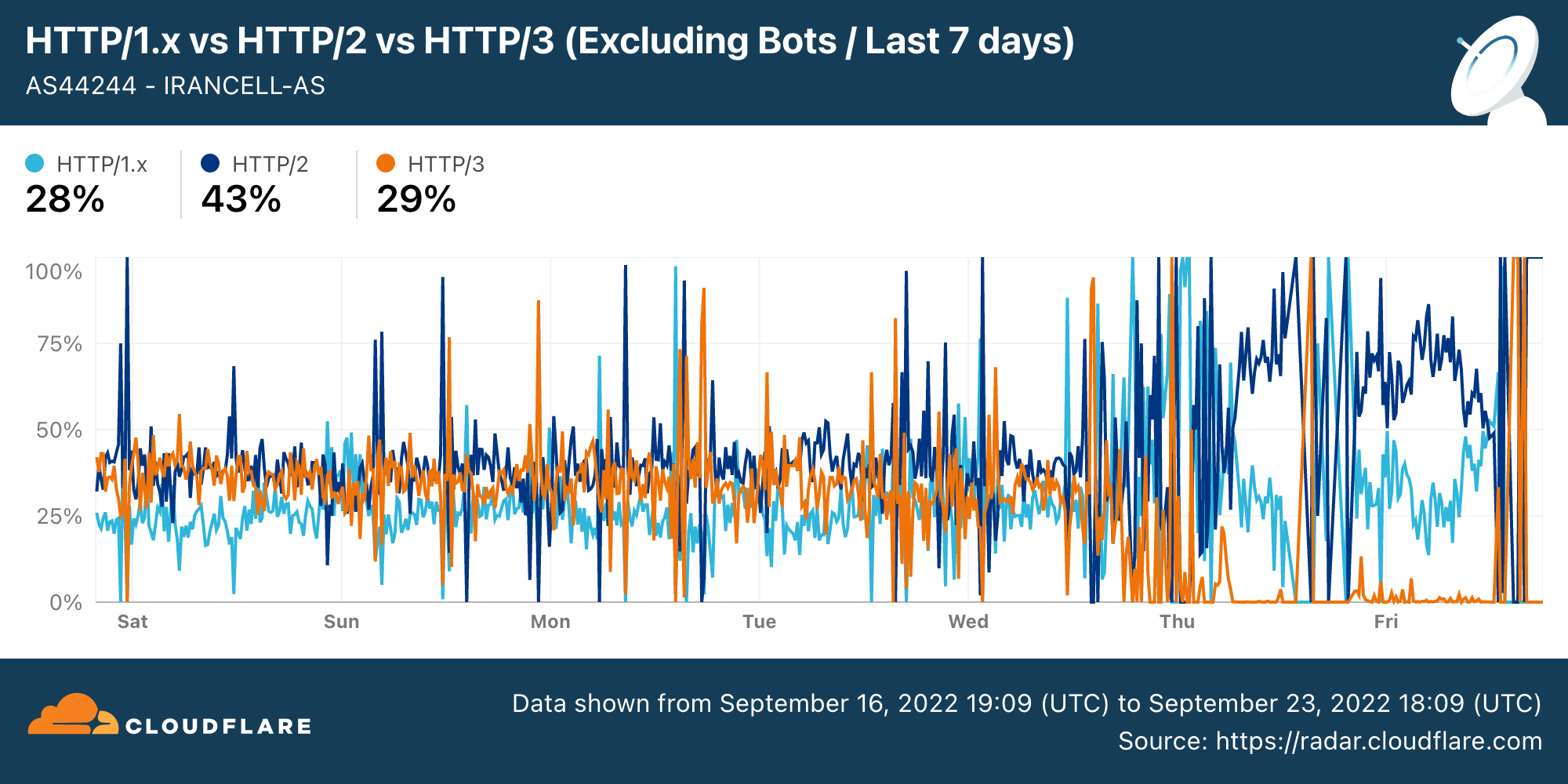 Chart: Cloudflare Radar signals for IranCell (AS44244) between 18th September 2022 to 25th September 2022 (source: Cloudflare Radar).