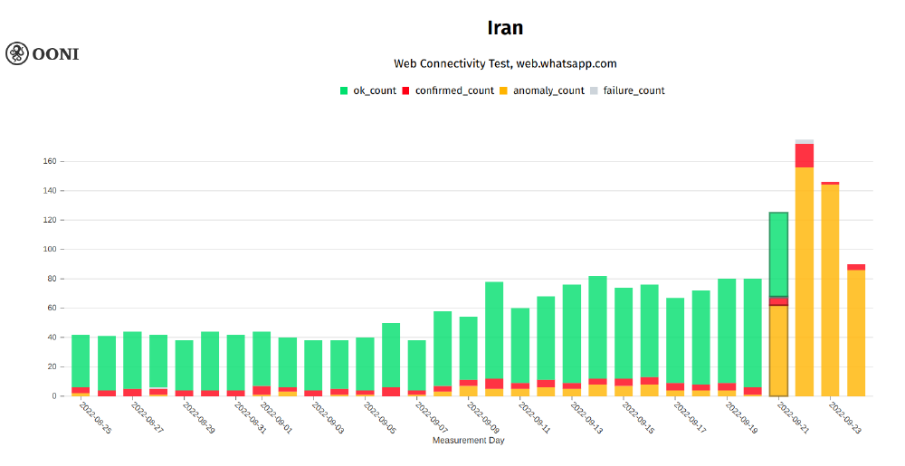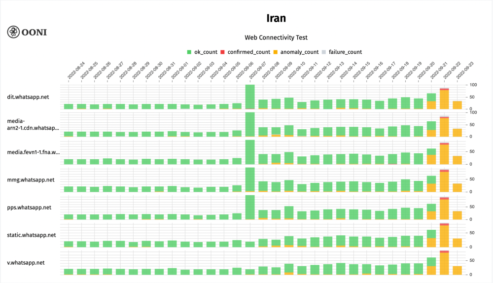 Chart: OONI data on the testing of web.whatsapp.com on multiple networks in Iran between August 2022 to September 2022 (source: OONI MAT).