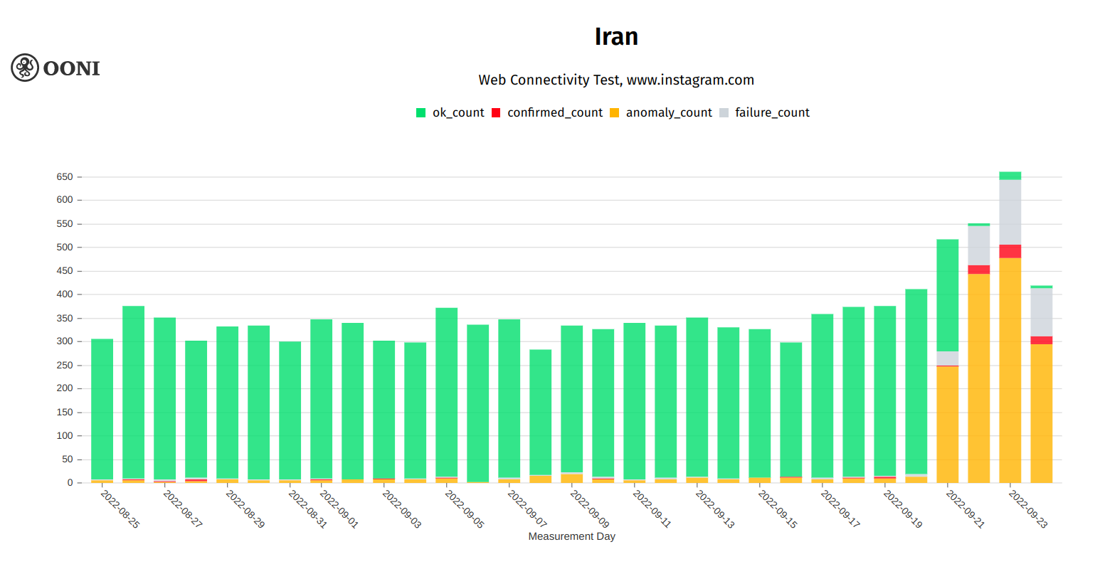 On 21st September 2022, OONI data started to show the blocking of WhatsApp and Instagram on most tested networks in Iran, while previously, they were among the few major social media platforms that were accessible on most tested networks. On the next day, 22nd September 2022, OONI data shows that Iranian ISPs started blocking access to Google’s Play Store and Apple’s App store as well, limiting Iranians’ ability to install new apps (such as circumvention tools). As of 23rd September 2022, OONI data shows that Iranian ISPs also started blocking access to Linkedin. Further details are provided in the report below.