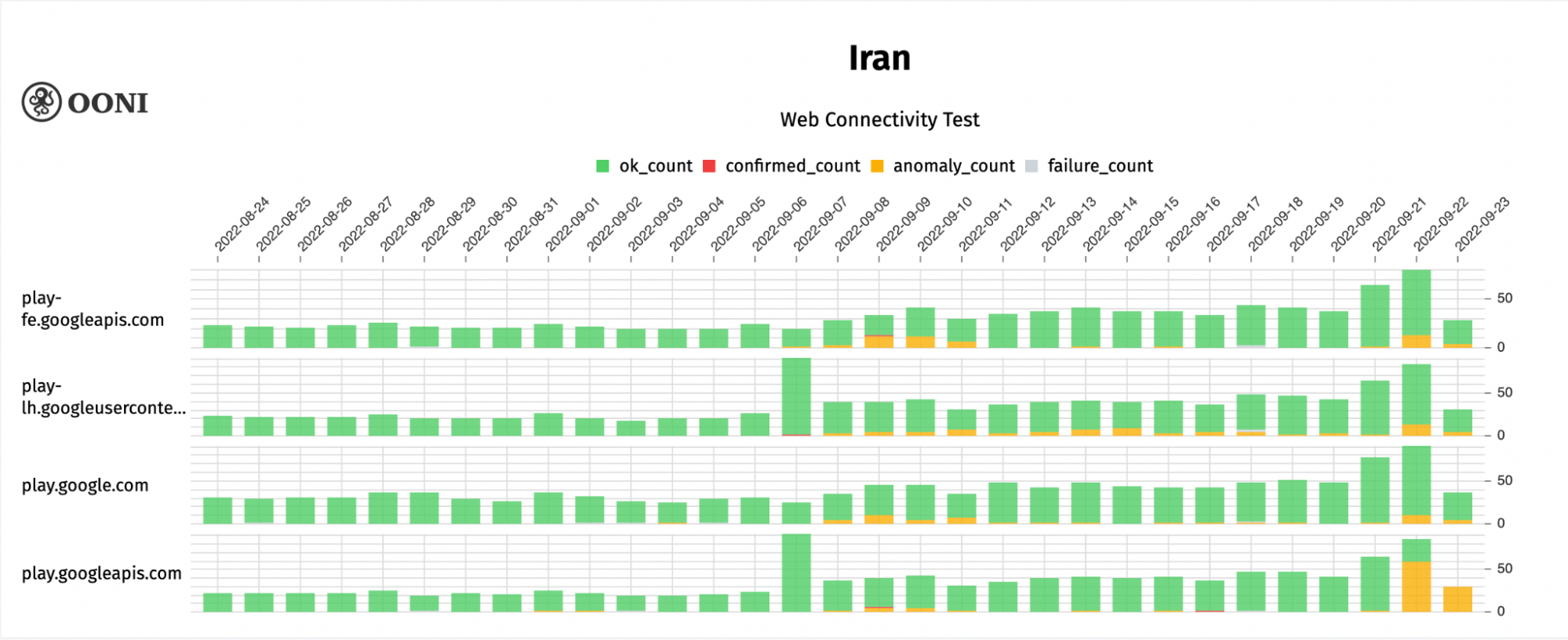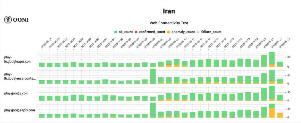 Chart: OONI data on the testing of domains related to Google Play Store in Iran between August 2022 to September 2022 (source: OONI MAT).