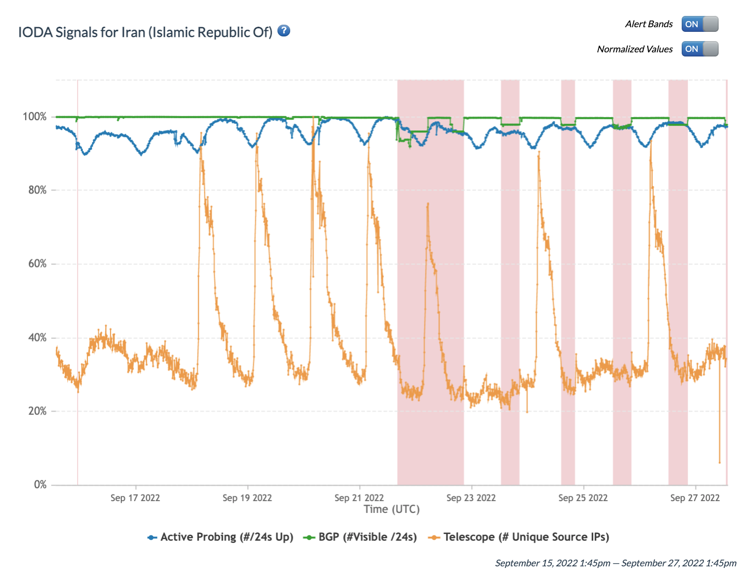 Chart: Internet Outage Detection and Analysis (IODA) signals for Iran between 16th September 2022 to 27th September 2022 (source: IODA).