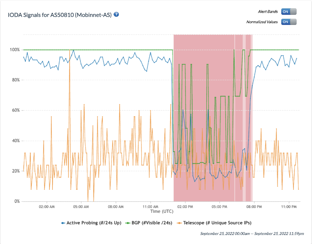Chart: Internet Outage Detection and Analysis (IODA) signals for Mobinnet (AS50810) on 25th September 2022 (source: IODA).