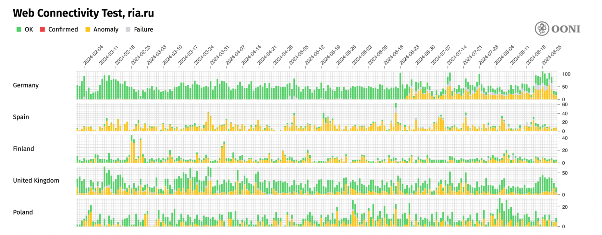 С июля 2024-го года появились новости о замедлении и блокировке YouTube в России. По последним данным OONI видно, что YouTube в основном доступен на большинстве сетей в России. Пользователи сообщают, что иногда платформа может быть доступна на мобильной сети, но заблокирована на кабельном подключении у одного и того же провайдера. Такую же стратегию озвучивало правительство, объявляя возможную блокировку YouTube.