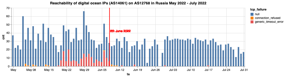 График: Доступность IP-адресов DigitalOcean IPs (AS14061) на сети AS12768 в России с мая по июль 2022 (источник: данные OONI).